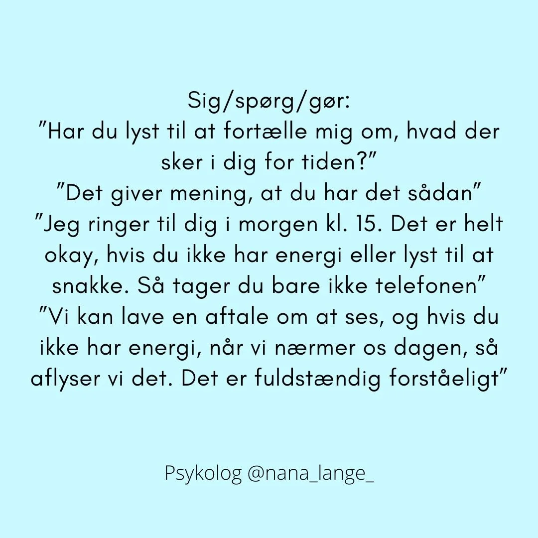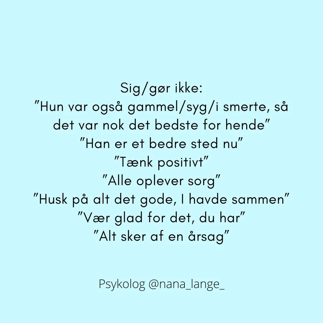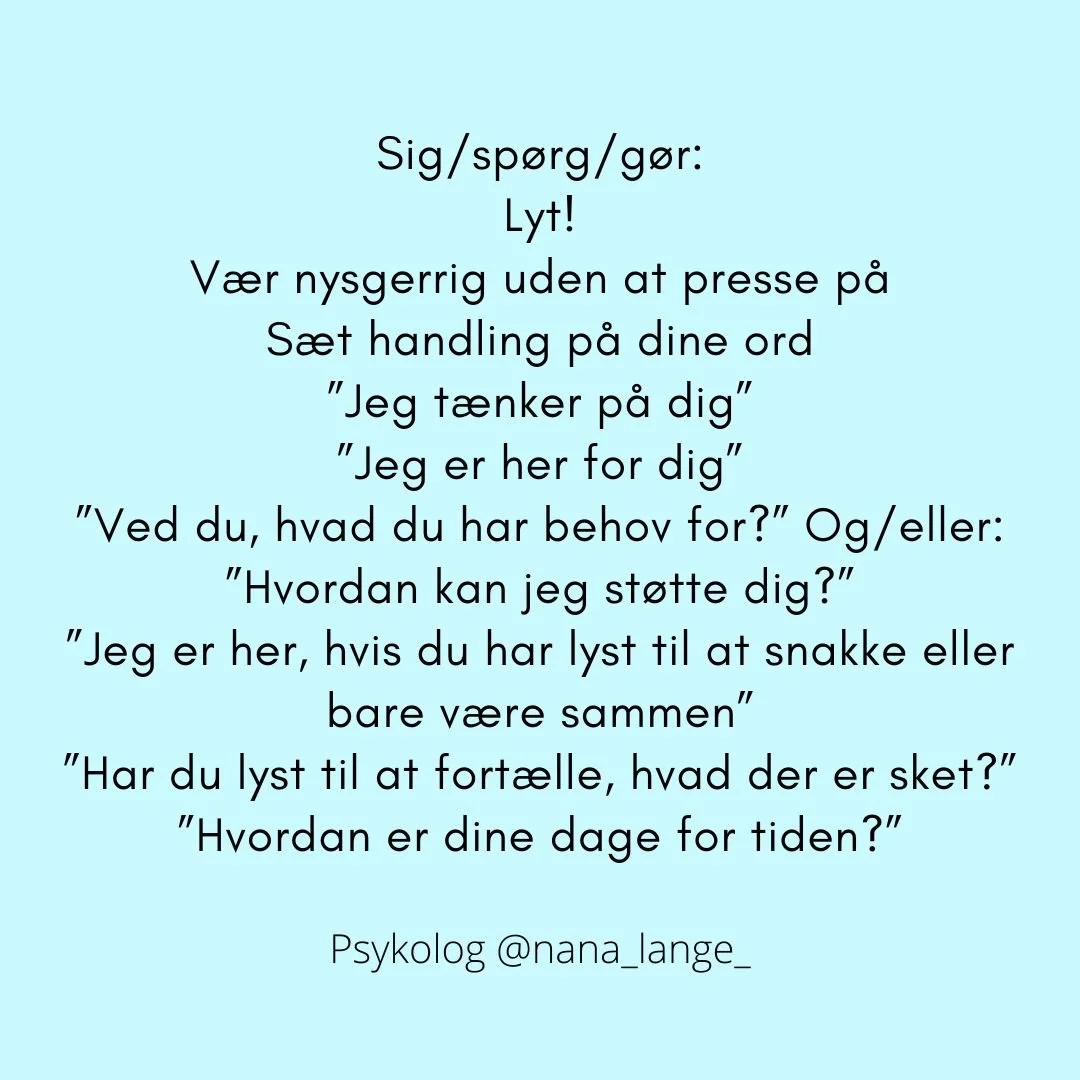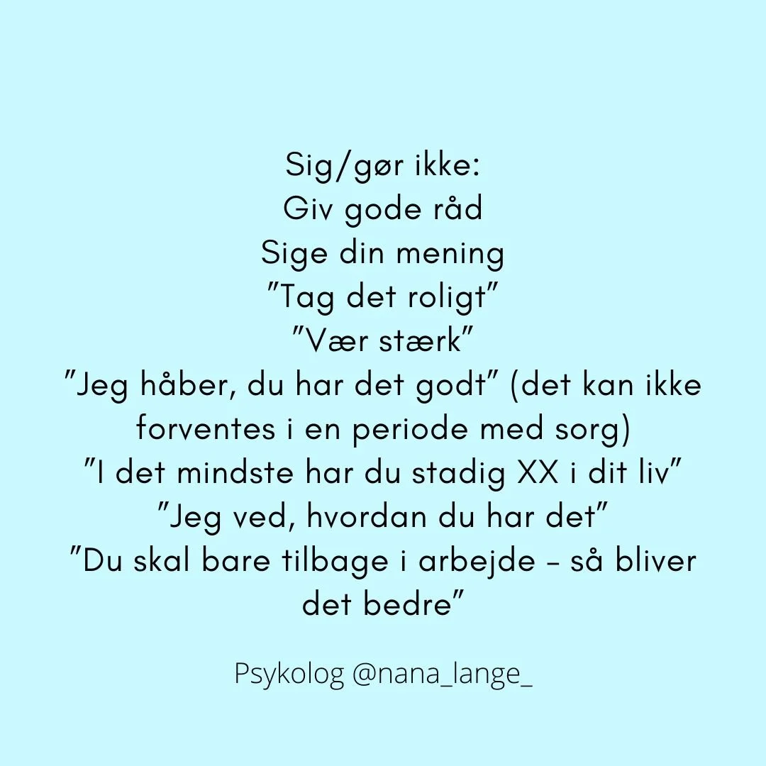 Det, de fleste sørgende savner, er, at folk spørger ind. At folk har modet til at tage kontakt, spørge ind, lytte og være der i sorgen med den sørgende. Ikke fikse. Ikke løse. Ikke fjerne smerten. Men være der MED personen i det, der er svært. Give plads. Se på fotos. Tale minder. Tørre tårer væk. Holde i hånd.