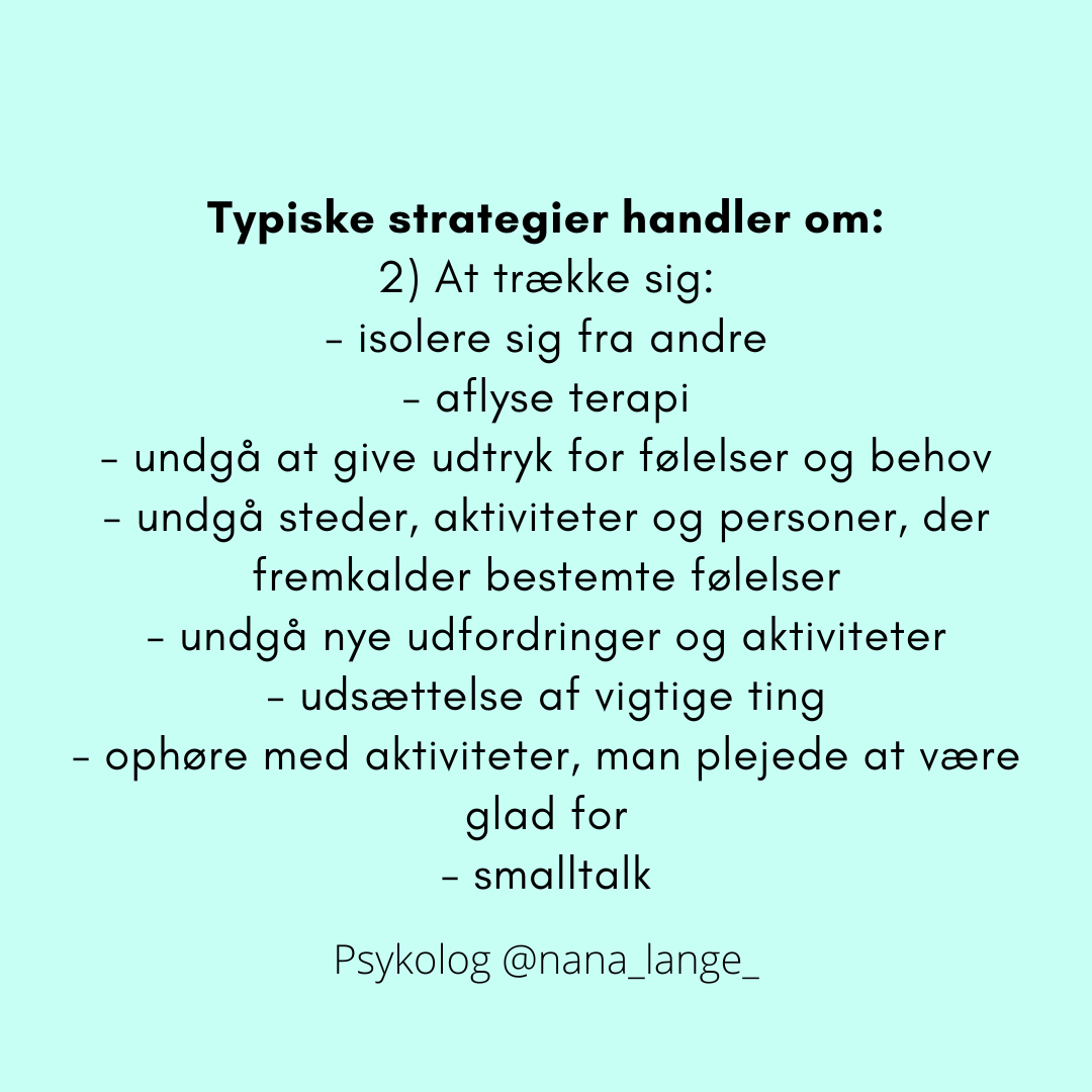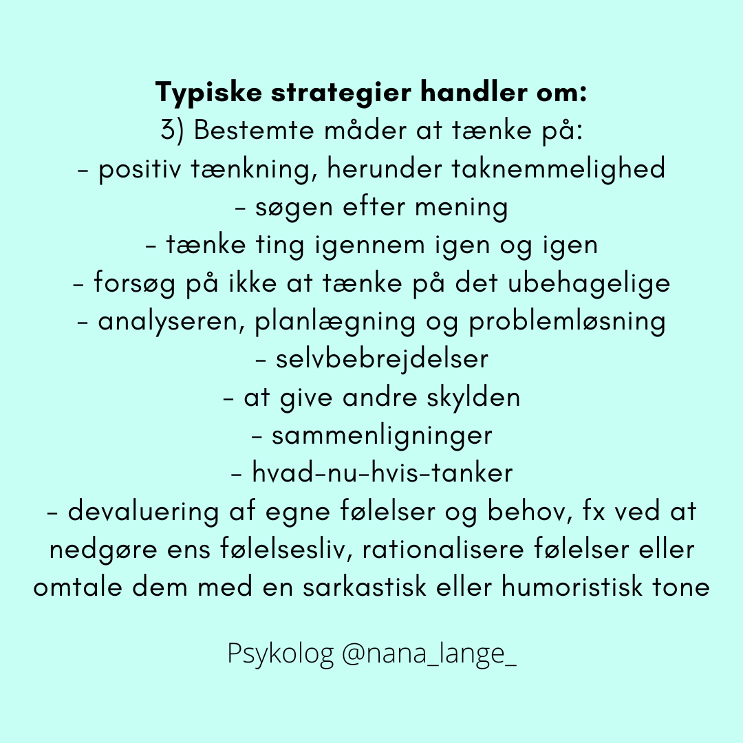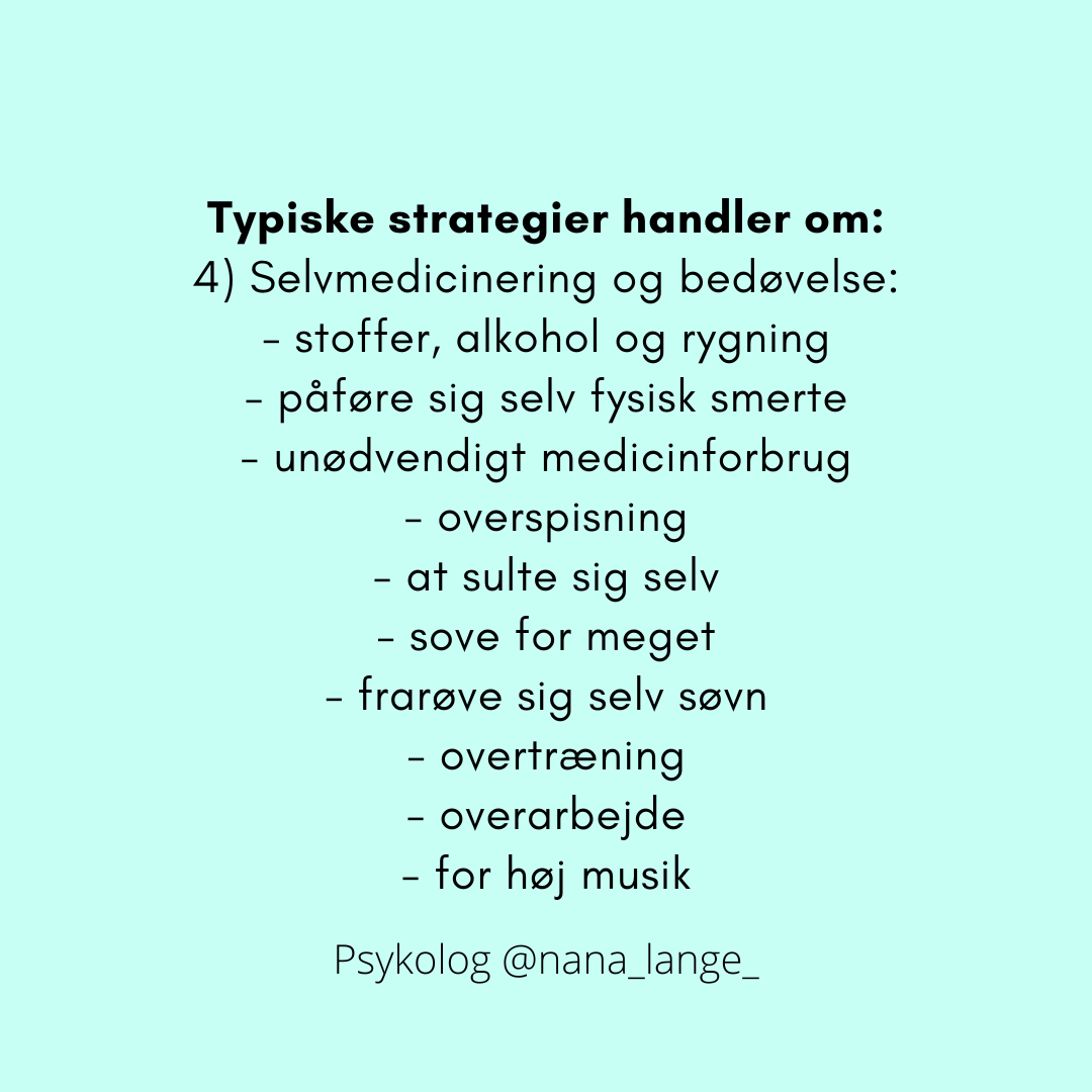 Jeg har her beskrevet fire typiske kontrolstrategier (distraktion, at trække sig, bestemte måder at tænke på og selvmedicinering/bedøvelse, og hvordan de kommer til udtryk).